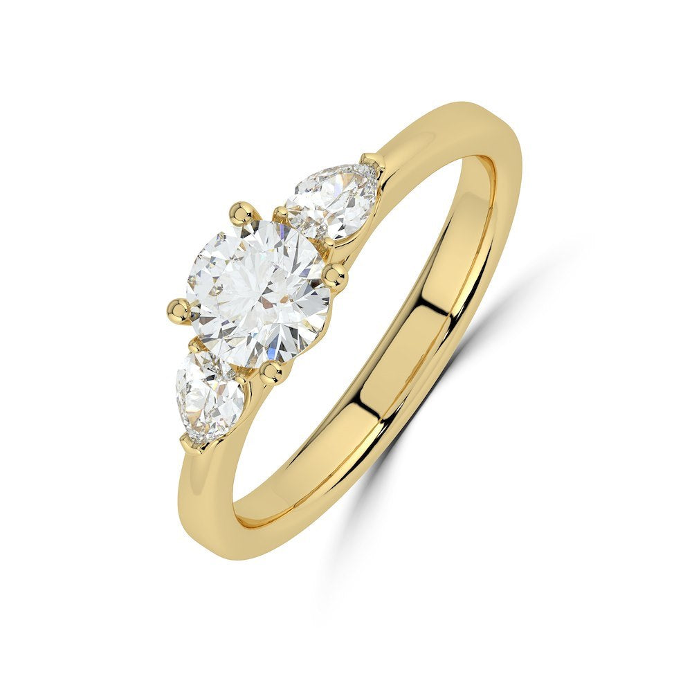 Iris is a pear trilogy defined by intention. Two pear-shaped diamonds sit at the shoulders with their points turned inward, creating a natural cradle around a round or oval centre stone that feels protective rather than decorative. It is the past, present and future expressed through a shape with direction.